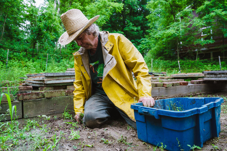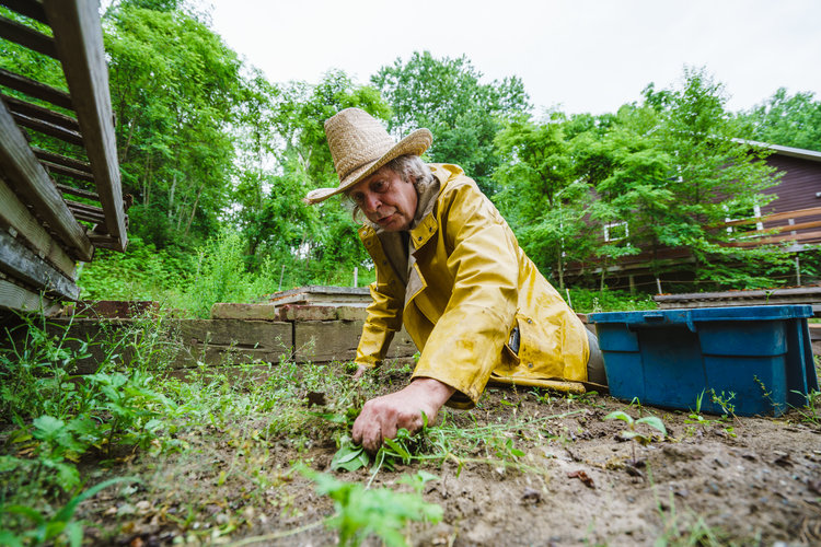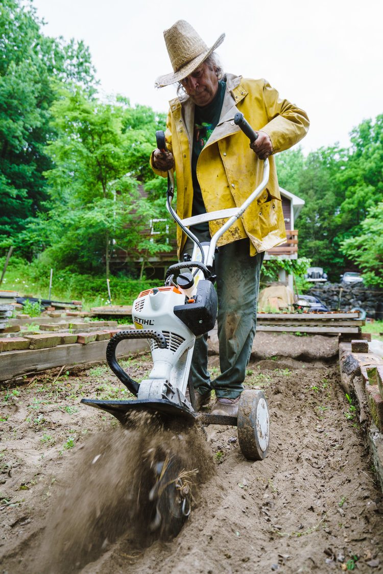 First I dig up the area where the Pachysandra is going to be planted. I could use a Tiller, a Shovel or a Mattock. The idea is to get any and all weeds and vines that are in the area out before we put the Pachysandra in. If you have too much clay, just add sand and top soil. If you have too much sand just add top soil. Most of the work is getting the soil ready. I use a Mattock which most people have although they may not know it. The Mattock is about 3' long and has a solid hoe on one side and an axe on the other side. I always work from my knees when planting Pachysandra. I carve a little trench in the ground with the Mattock. About 3"deep and 42" long starting from the highest tops and working my way down any slope. If the Pachysandra has runners on, I lay the runners in the row. If a runner breaks, I simply lay the runner in the trench.